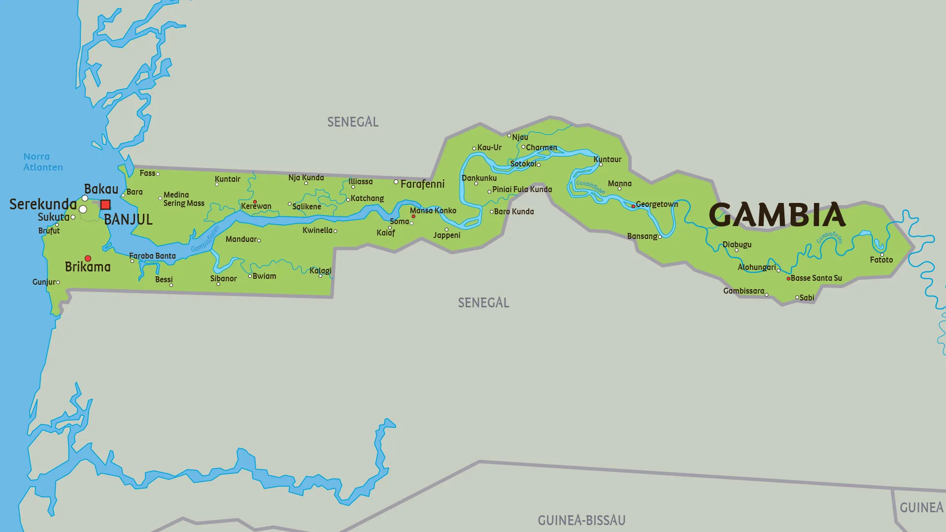 Nedanför visas en karta över Gambia.