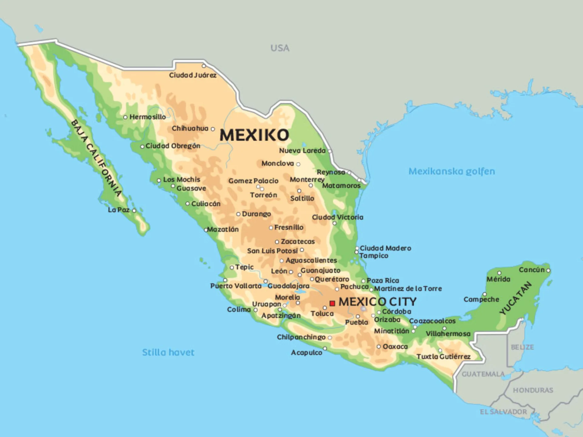 Få en översikt över Mexikos geografi - från Mexico City till Tijuana i norr och Cancún vid Mexikanska golfen.