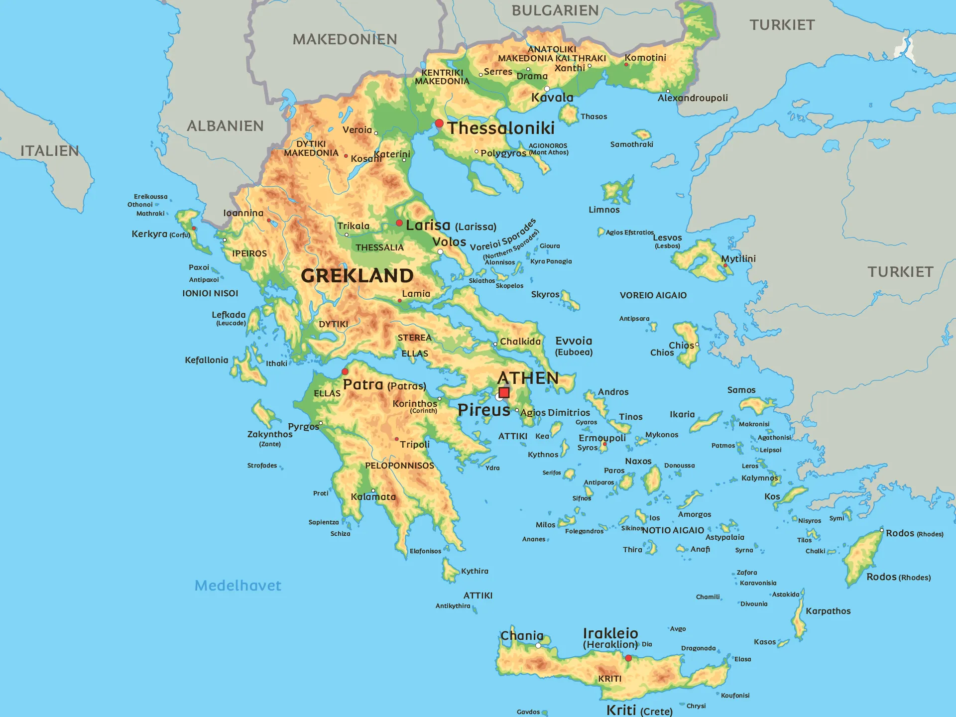 Utforska Greklands geografi närmare på kartan nedanför. Se bland annat placeringen av huvudstaden Aten.
