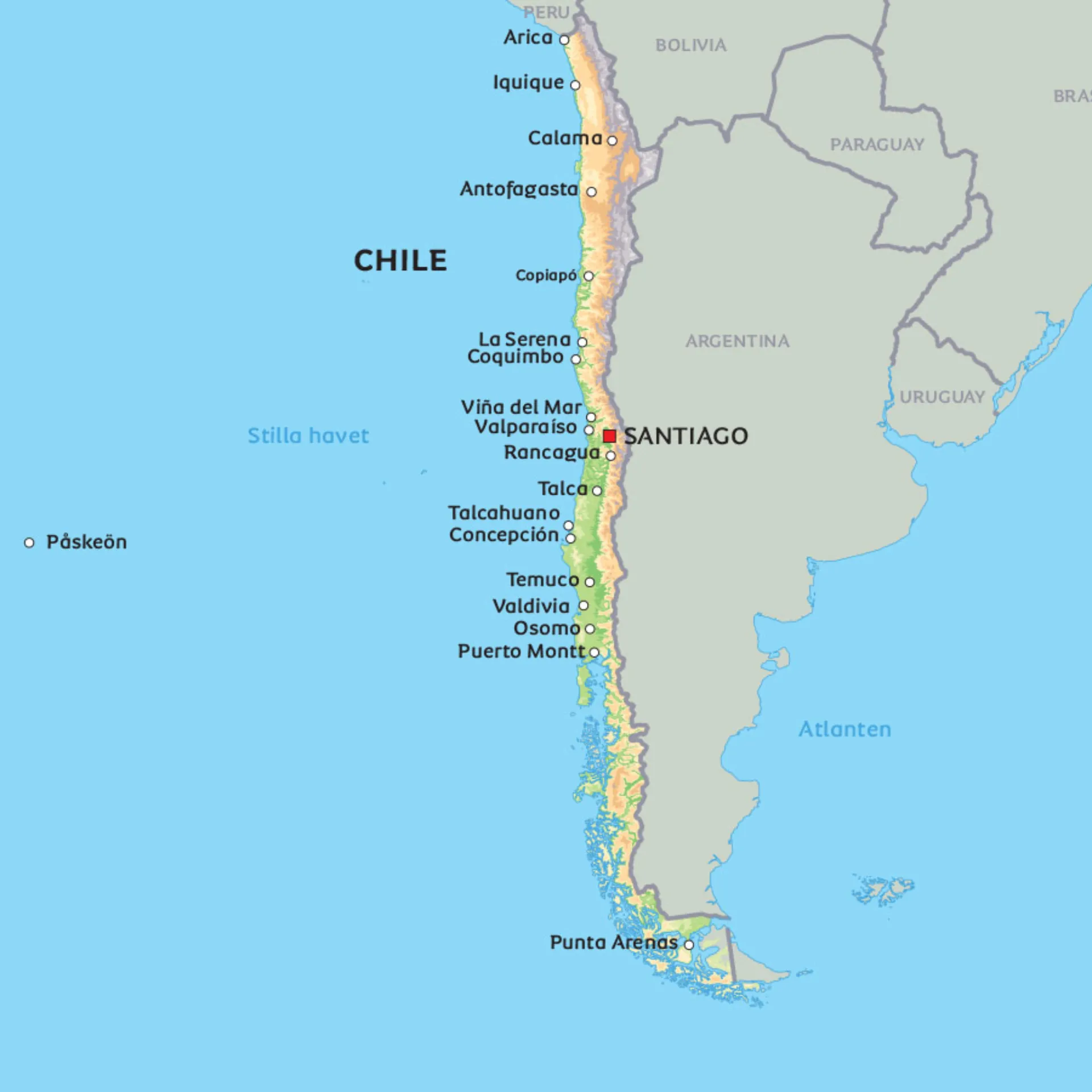 På kartan nedanför kan du utforska Chiles geografi. Finn exempelvis huvudstaden Santiago och Påskön.